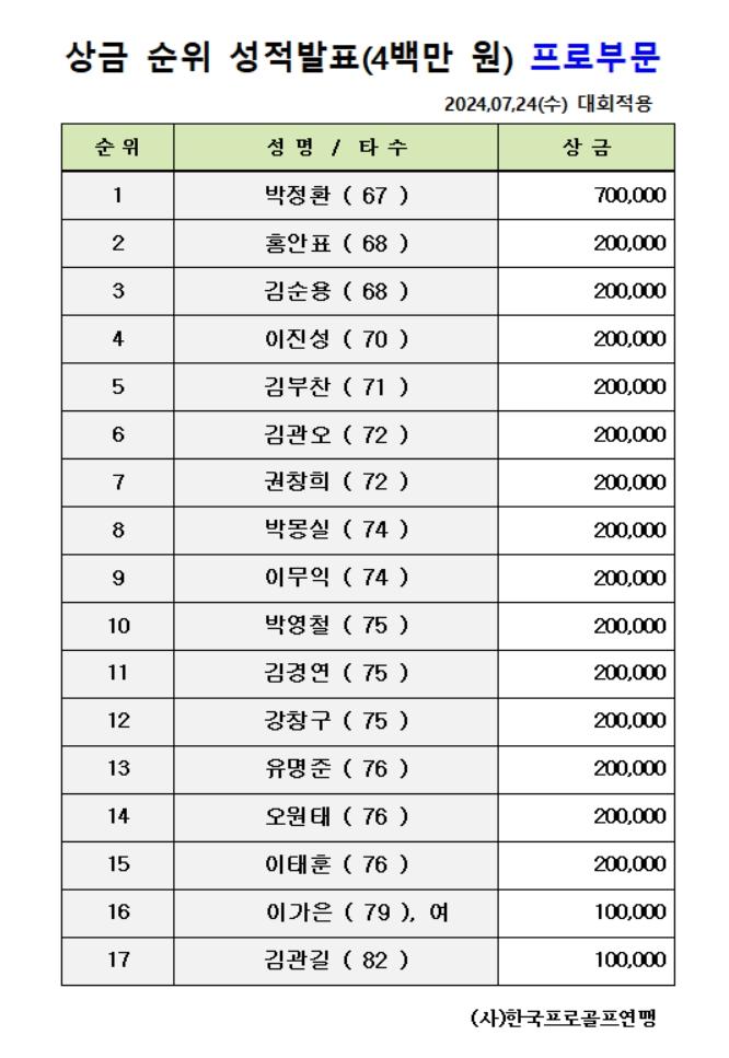 2024 KPGF 토비&베트리안 프로암골프대회 상금 순위 발표 (7/24기준)
